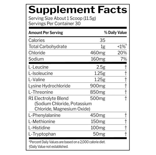 The body cannot make essential aminos, so it must be consumed through a balanced and healthy diet. If you are not getting enough nutrients through your diet, then a supplement may help to support the imbalances. R1 Essential Amino 9 delivers 7.5g of all 9 essential amino with tea leaf extract for energy and added electrolytes for hydration.