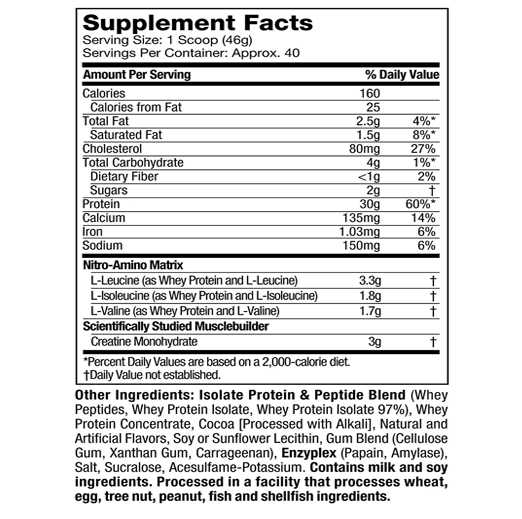 In a six-week, double-blind study involving 36 test subjects with at least three years of weight-training experience divided into three groups, subjects combining the core ingredients in Nitro-Tech with a weight-training program gained 70% more lean muscle than subjects using regular whey protein 8.8 vs 2.0 lbs.) This formula provides 30 g of protein from ultra-pure protein. Plus, it delivers a clinically proven dose of creatine.