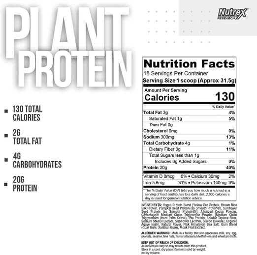 Nutrex Research Plant Protein. Great Tasting Vegan Plant Based Protein. No Artificial Flavours, Colors, or Sweeteners, Gluten Free and Lactose Free.