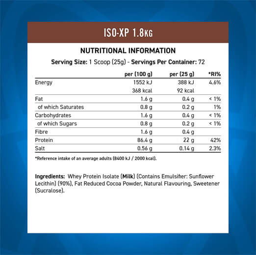 HIGH IN PROTEIN: our whey isolate protein powder delivers a whopping minimum of 21.6g of protein per serving, all whilst remaining low in sugars, and fats. ISO-XP even has less than 1g of carbs per serving!