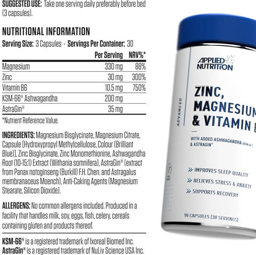 Applied Nutrition ZMA Zinc, Magnesium & Vitamin B6 With Ashwagandha.